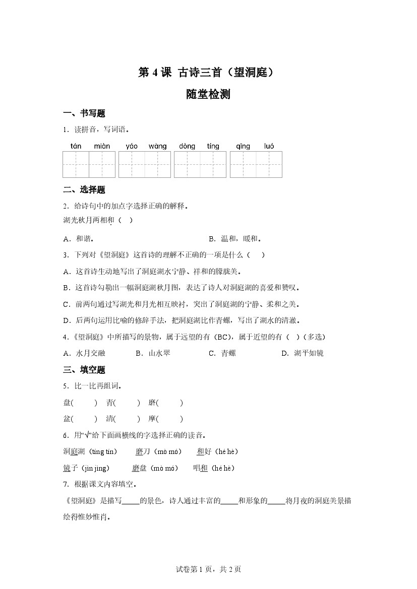 25年秋【三上语文】第4课 古诗三首(望洞庭)随堂检测