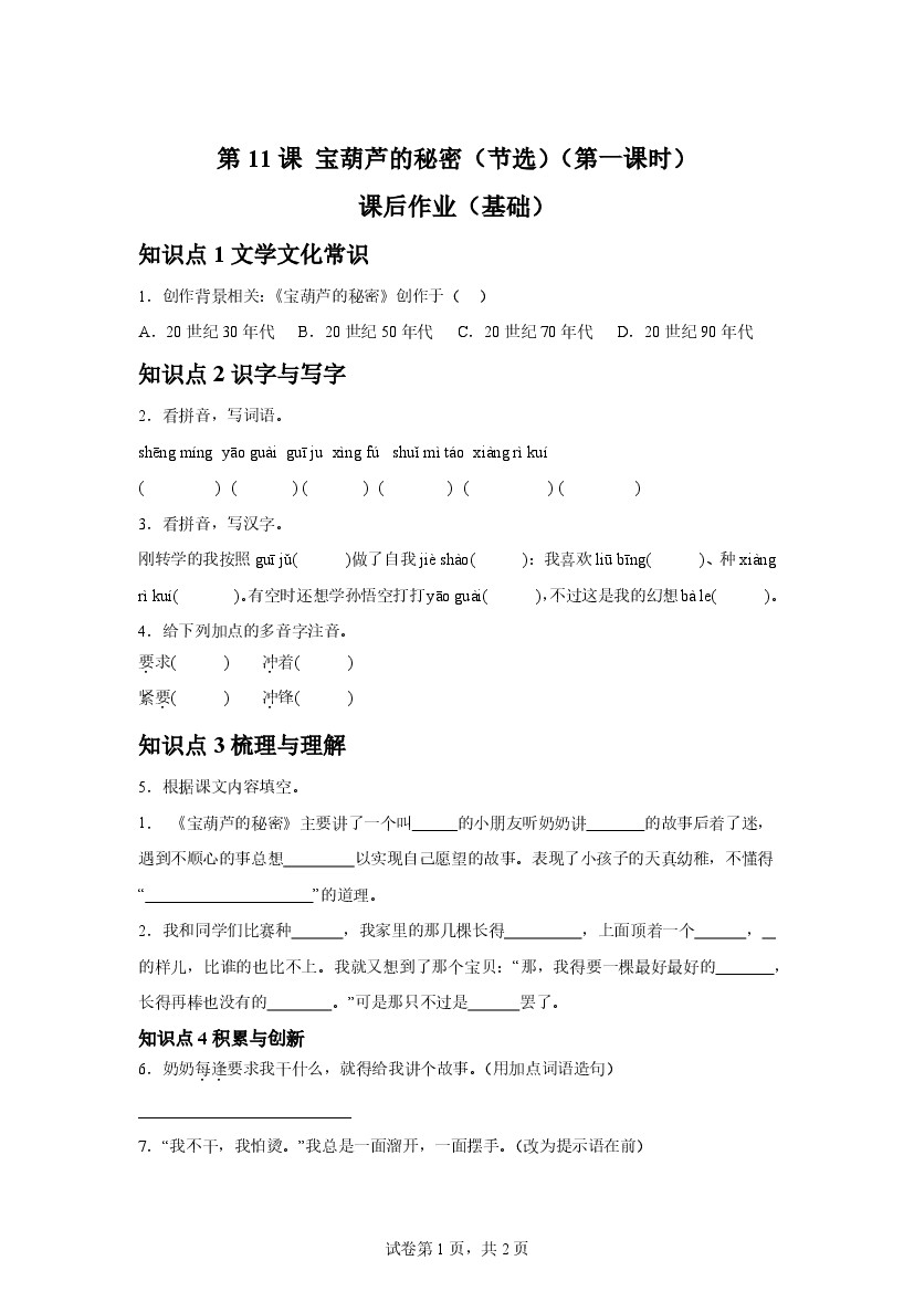 25年秋【三上语文】第11课 宝葫芦的秘密(节选)(第一课时)课后作业(基础)