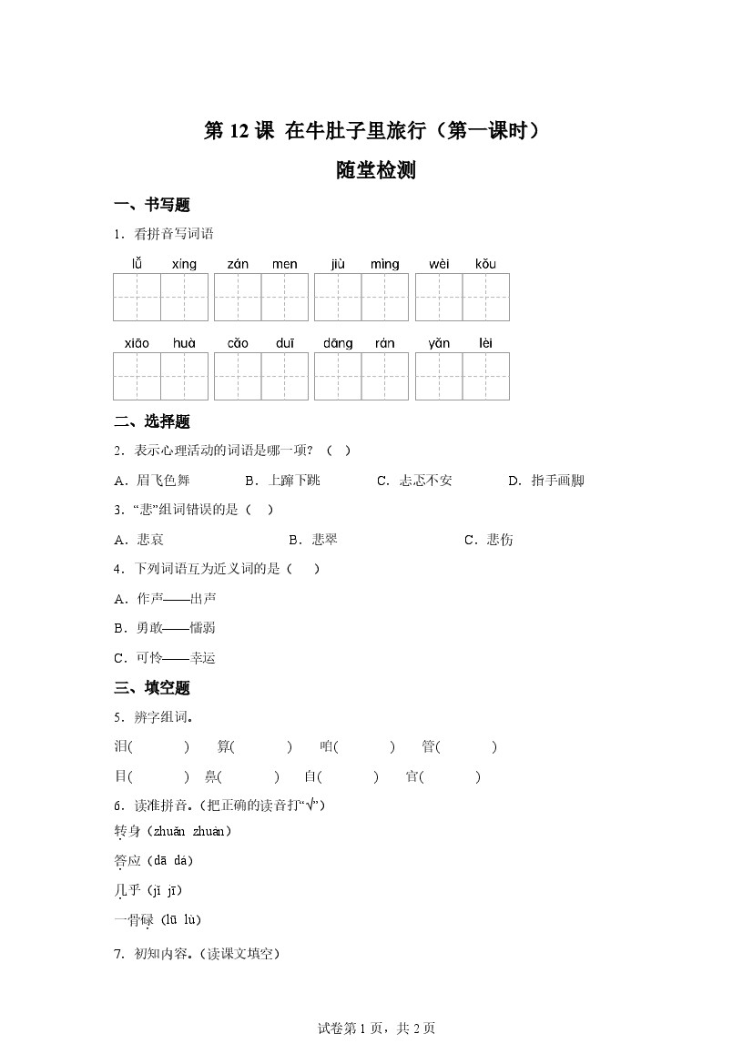 25年秋【三上语文】第12课 在牛肚子里旅行(第一课时)随堂检测