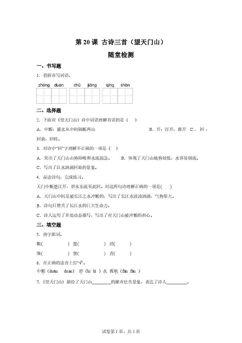 25年秋【三上语文】第20课 古诗三首(望天门山)随堂检测