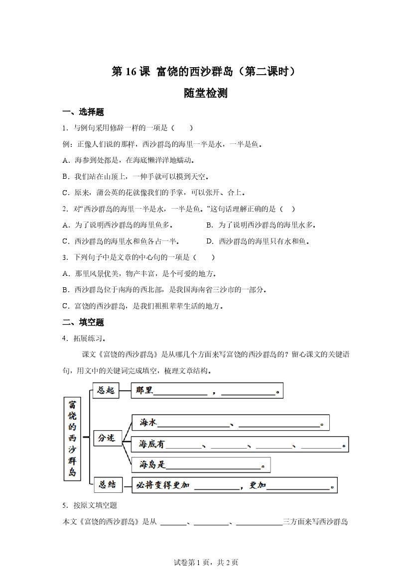 25年秋【三上语文】第16课 富饶的西沙群岛(第二课时)随堂检测