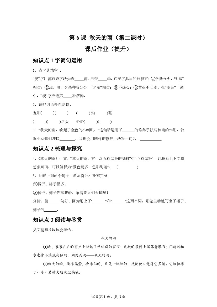 25年秋【三上语文】第6课 秋天的雨(第二课时)课后作业(提升)