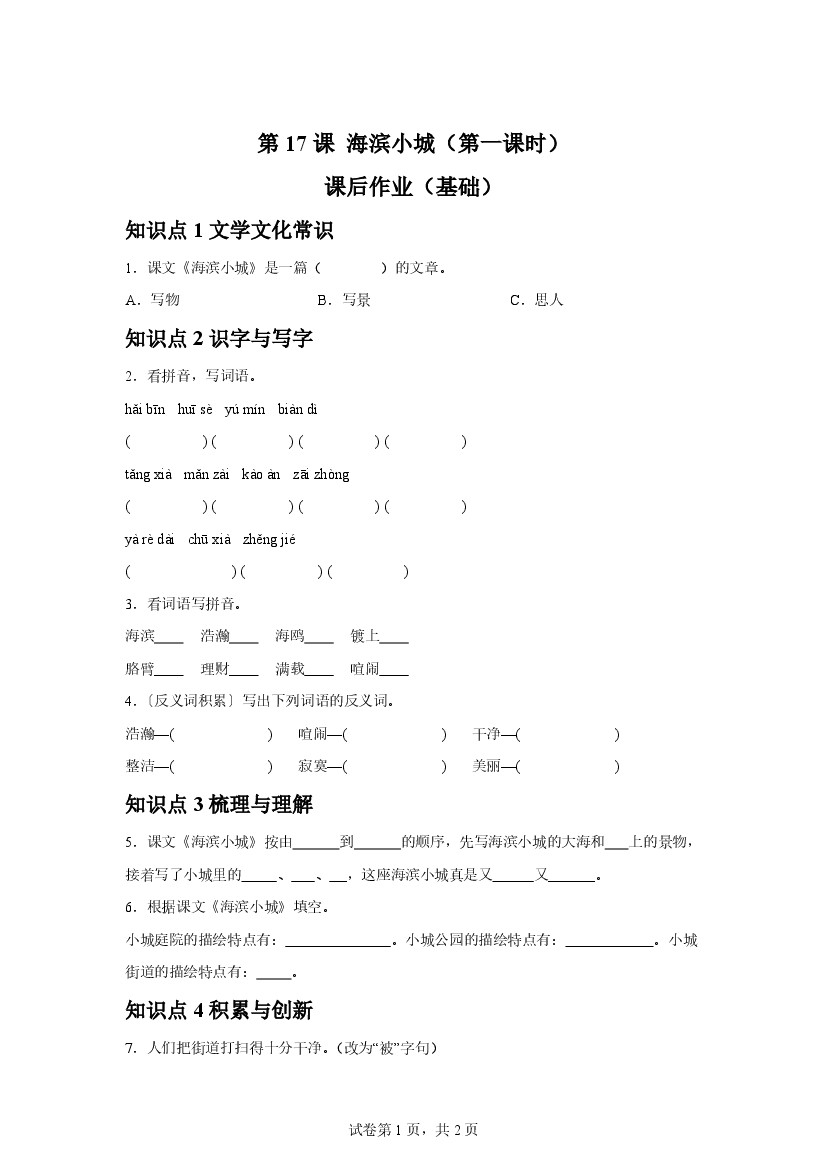 25年秋【三上语文】第17课 海滨小城(第一课时)课后作业(基础)