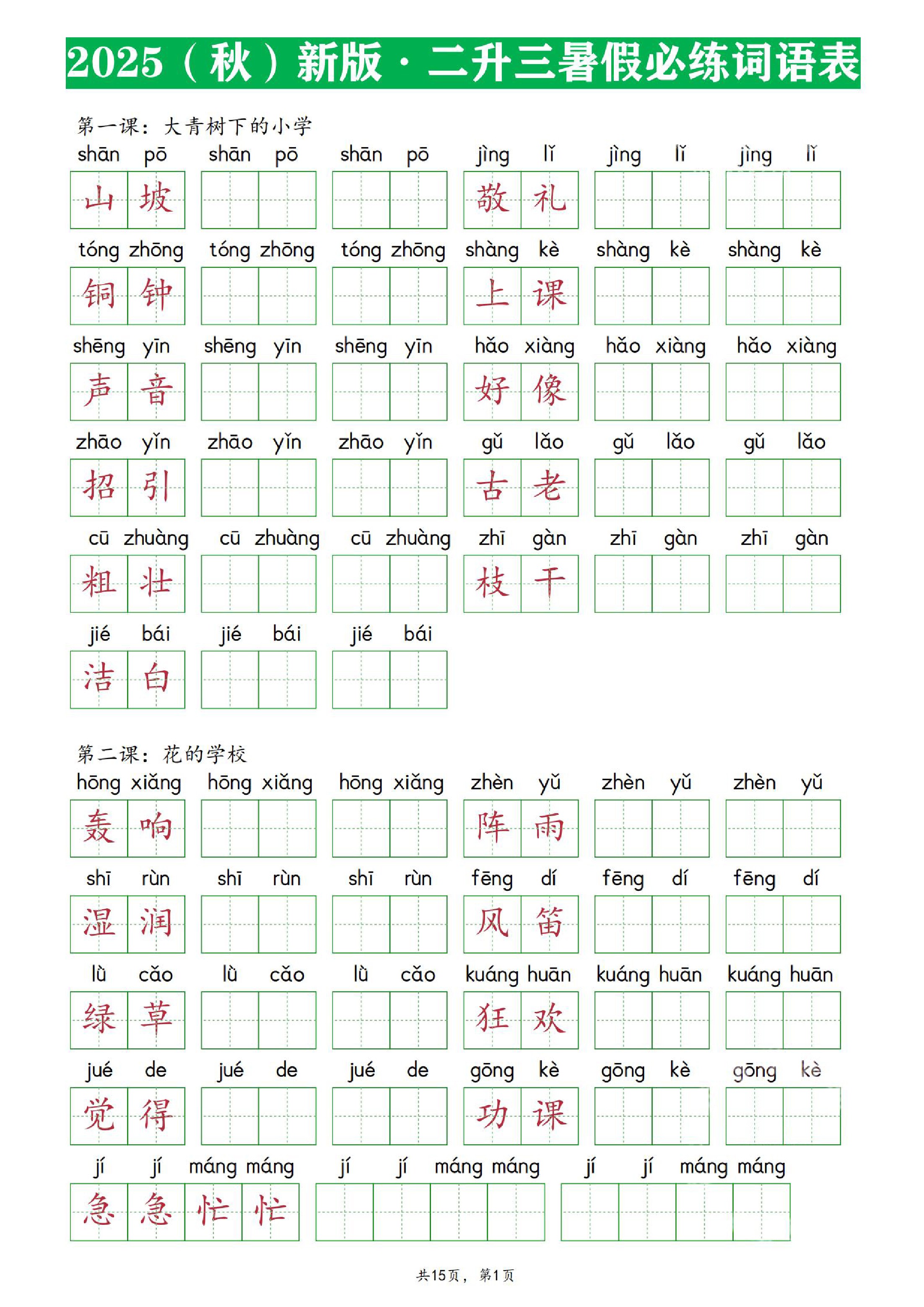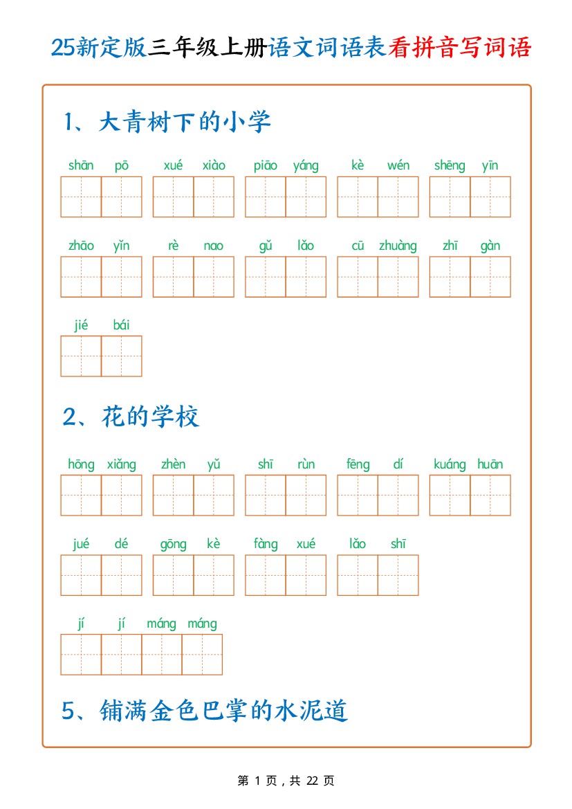 【25新定版三上语文词语表看拼音写词语(250个词)含答案22页