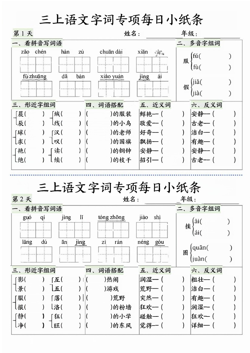 三年级 (上) 语文【字词专项】每日小纸条