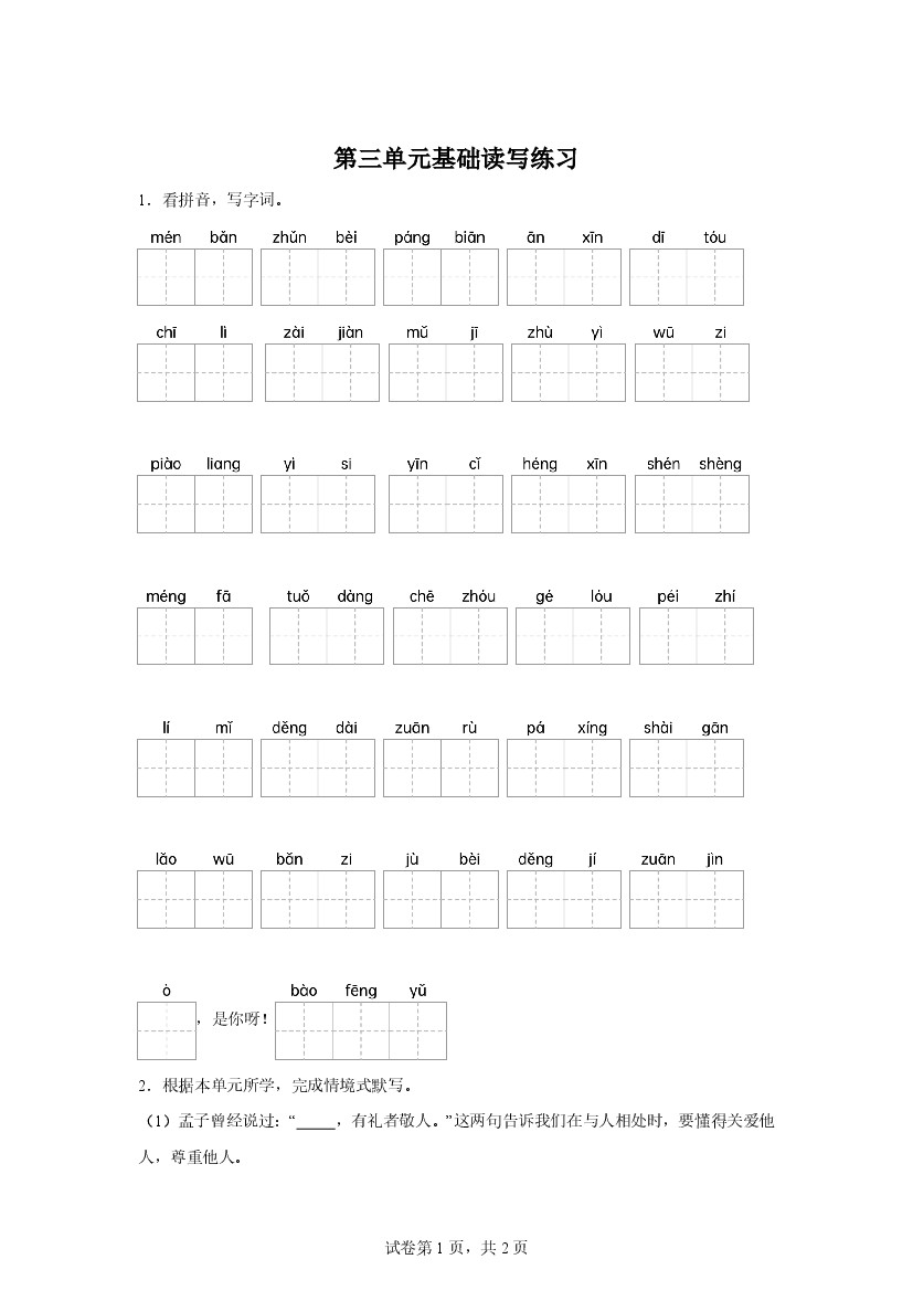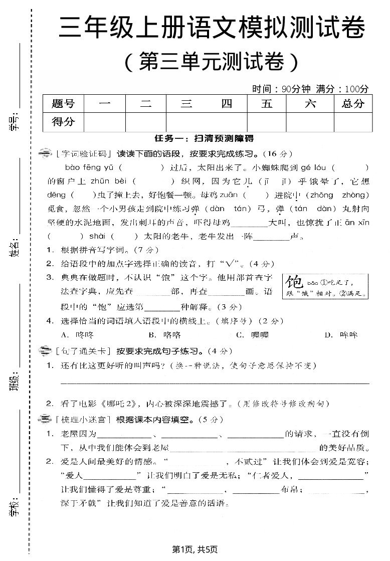 三年级(上)语文第三单元提优情景测试卷