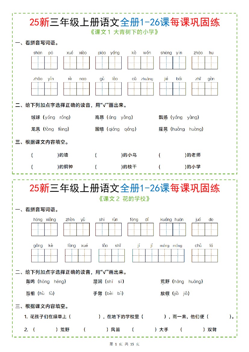 【25新三上语文全册1-26课每课巩固练小纸条(含答案15页)