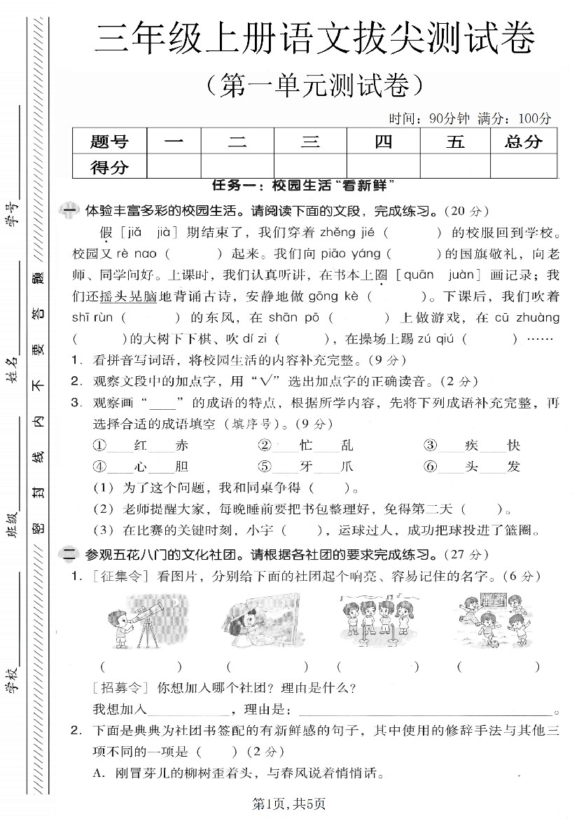 三年级上册语文第一单元拔尖测试卷(含答案5页)