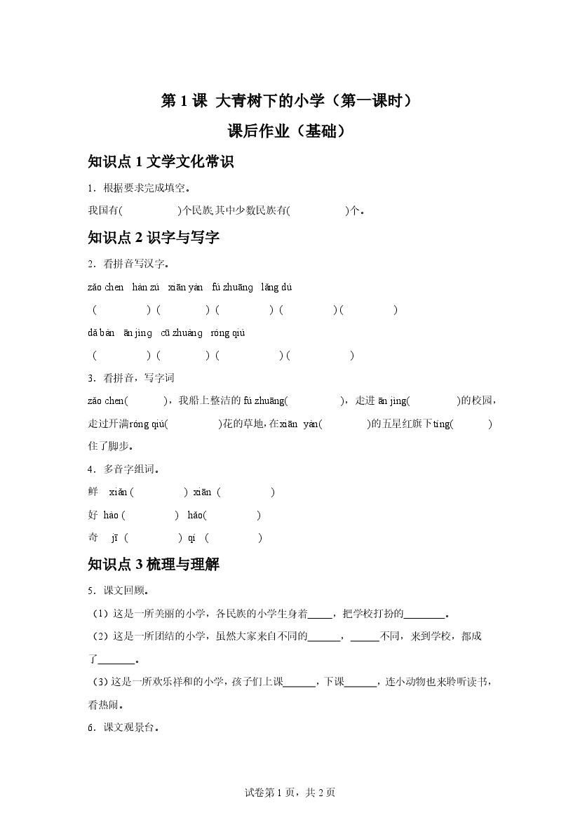 25年秋【三上语文】第1课 大青树下的小学(第一课时)课后作业(基础)