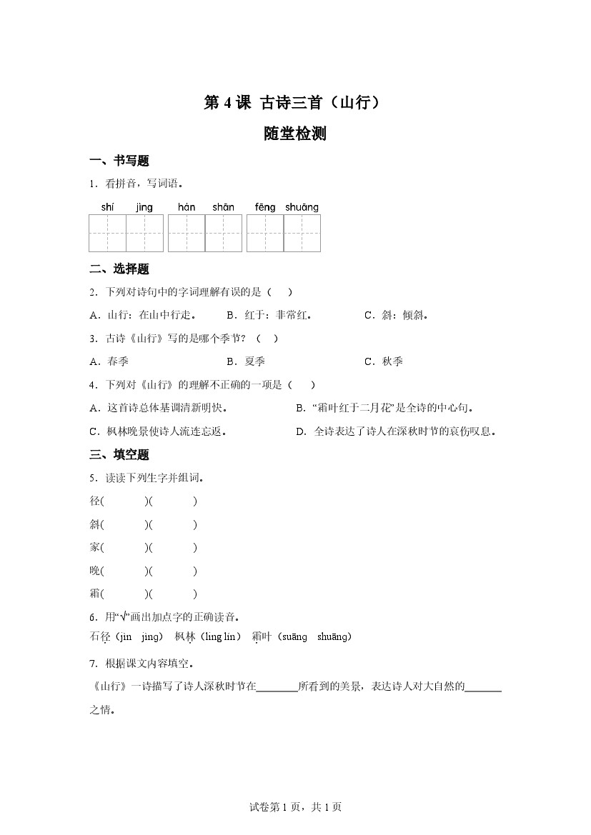25年秋【三上语文】第4课 古诗三首(山行)随堂检测