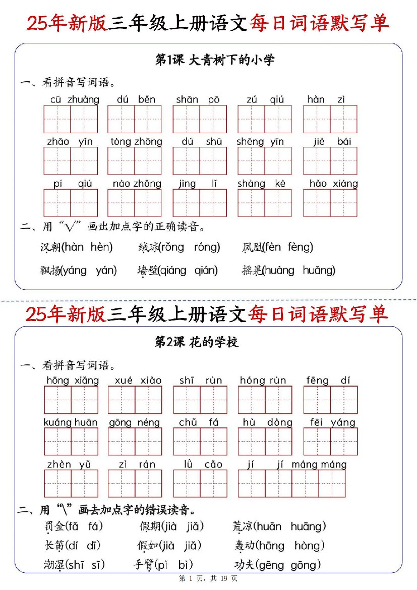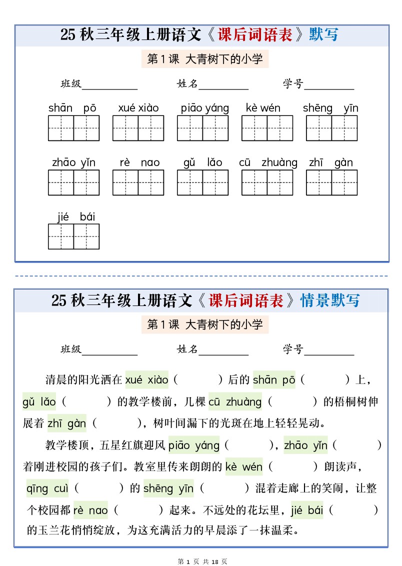 【25秋三上语文课后词语表情景默写通关小单(含答案21页)