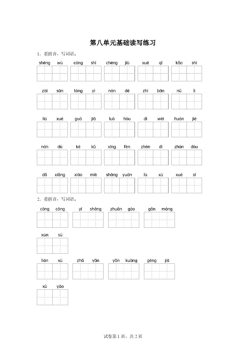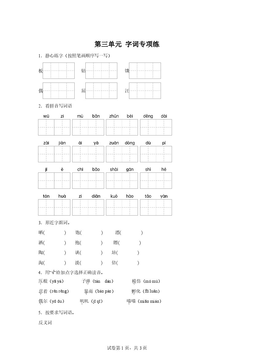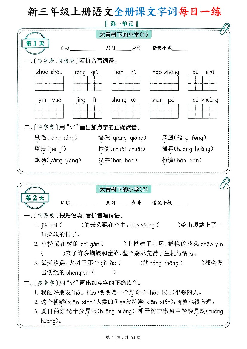 新三上语文全册课文字词每日一练74天(含答案53页)