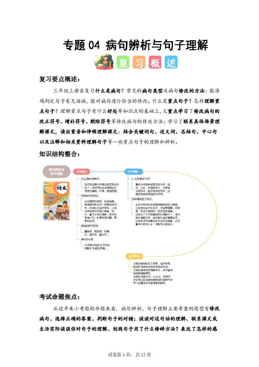 专题04 病句辨析与句子理解-2025年三年级语文寒假专项提升(统编版)