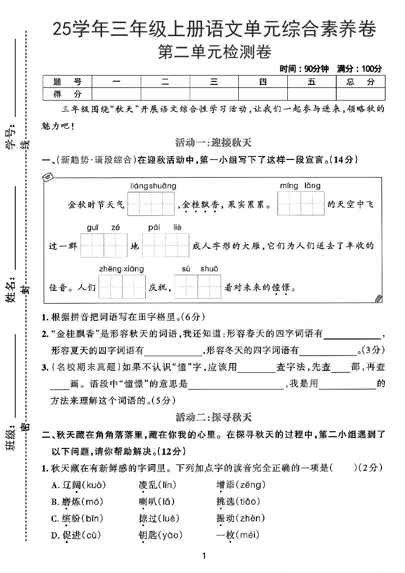 25秋新三年级上册语文第二单元 金秋时节(单元测试·提高卷)(新教材)
