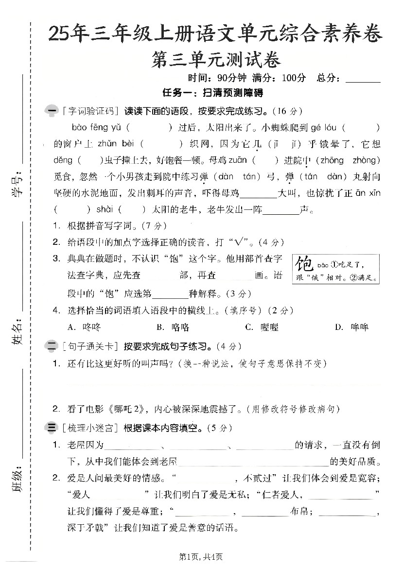【25学年三上语文第一单元素养评估卷(含答案7页)