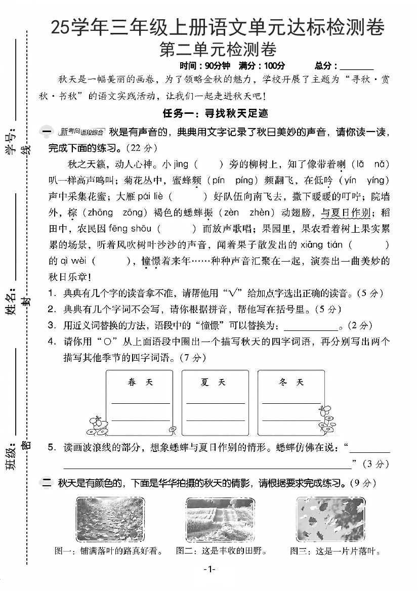 【25学年三上语文第二单元达标检测卷-秋天(含答案5页)