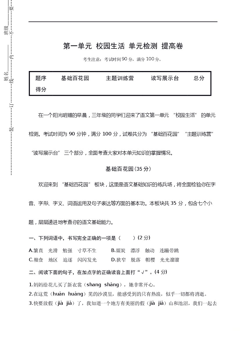 25秋新三年级上册语文第一单元 校园生活(单元测试·提高卷)(新教材)