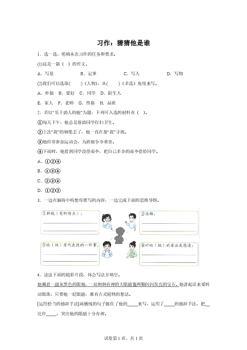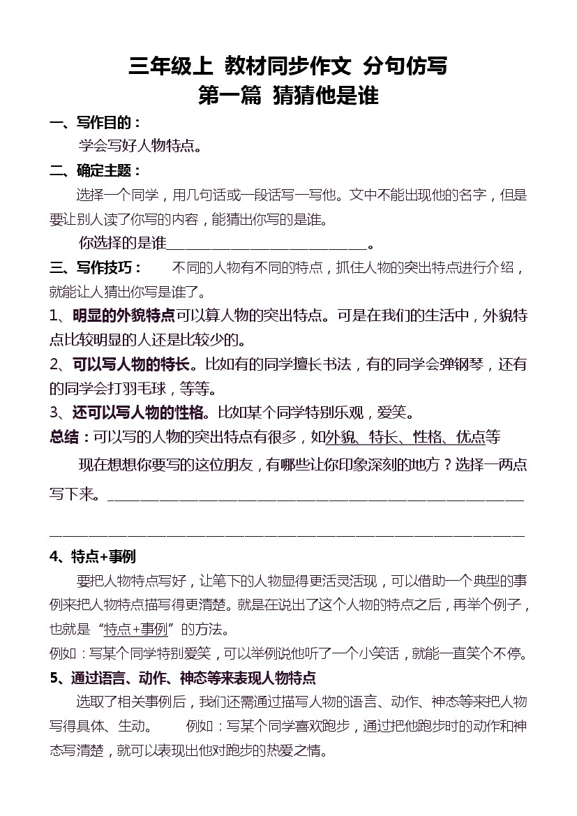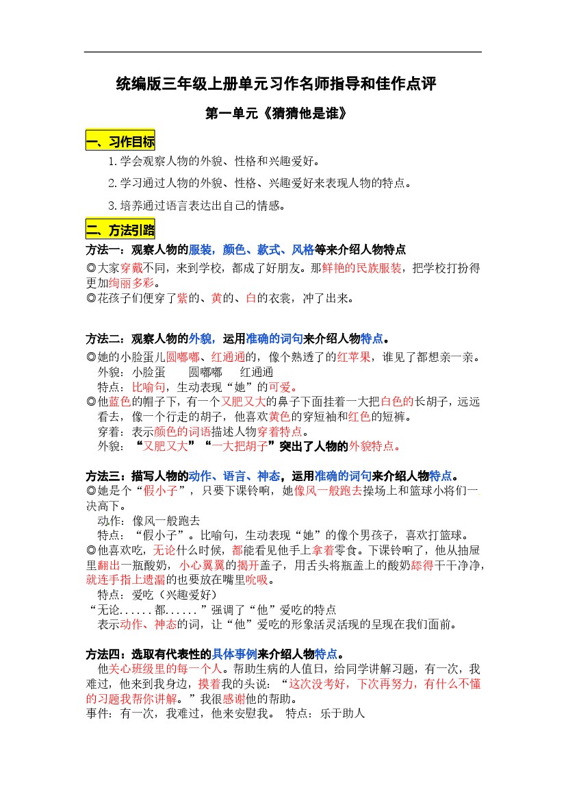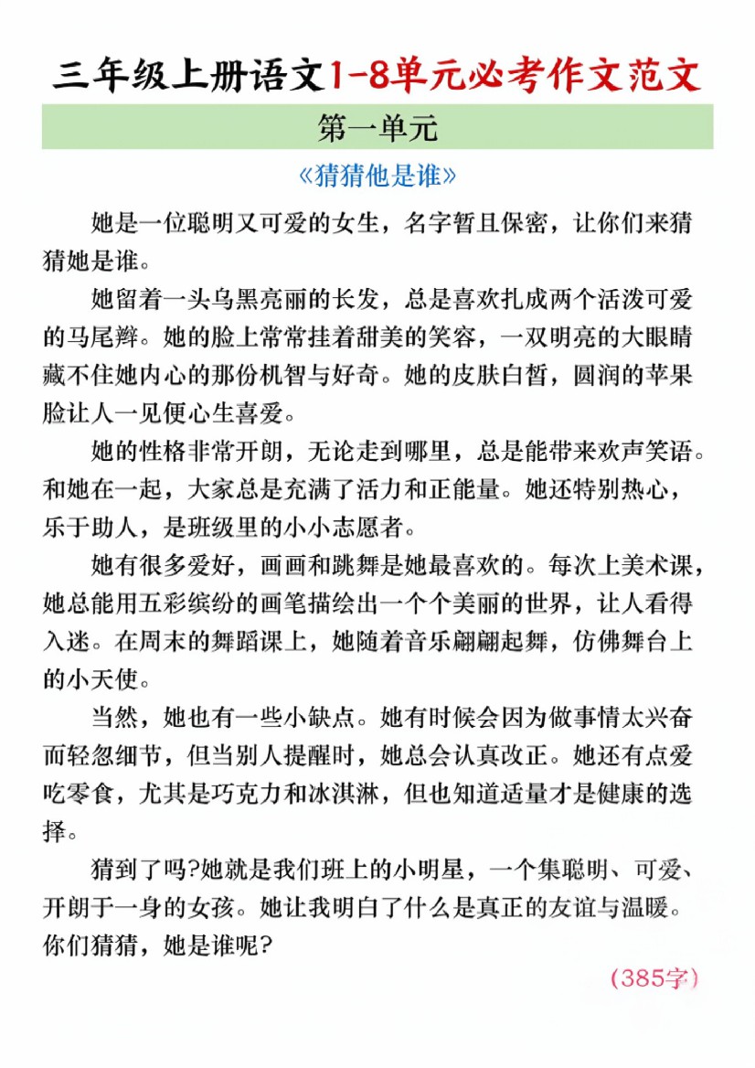 人教部编版三年级语文上册第1单元《猜猜他是谁》名师指导和佳作点评(13篇)