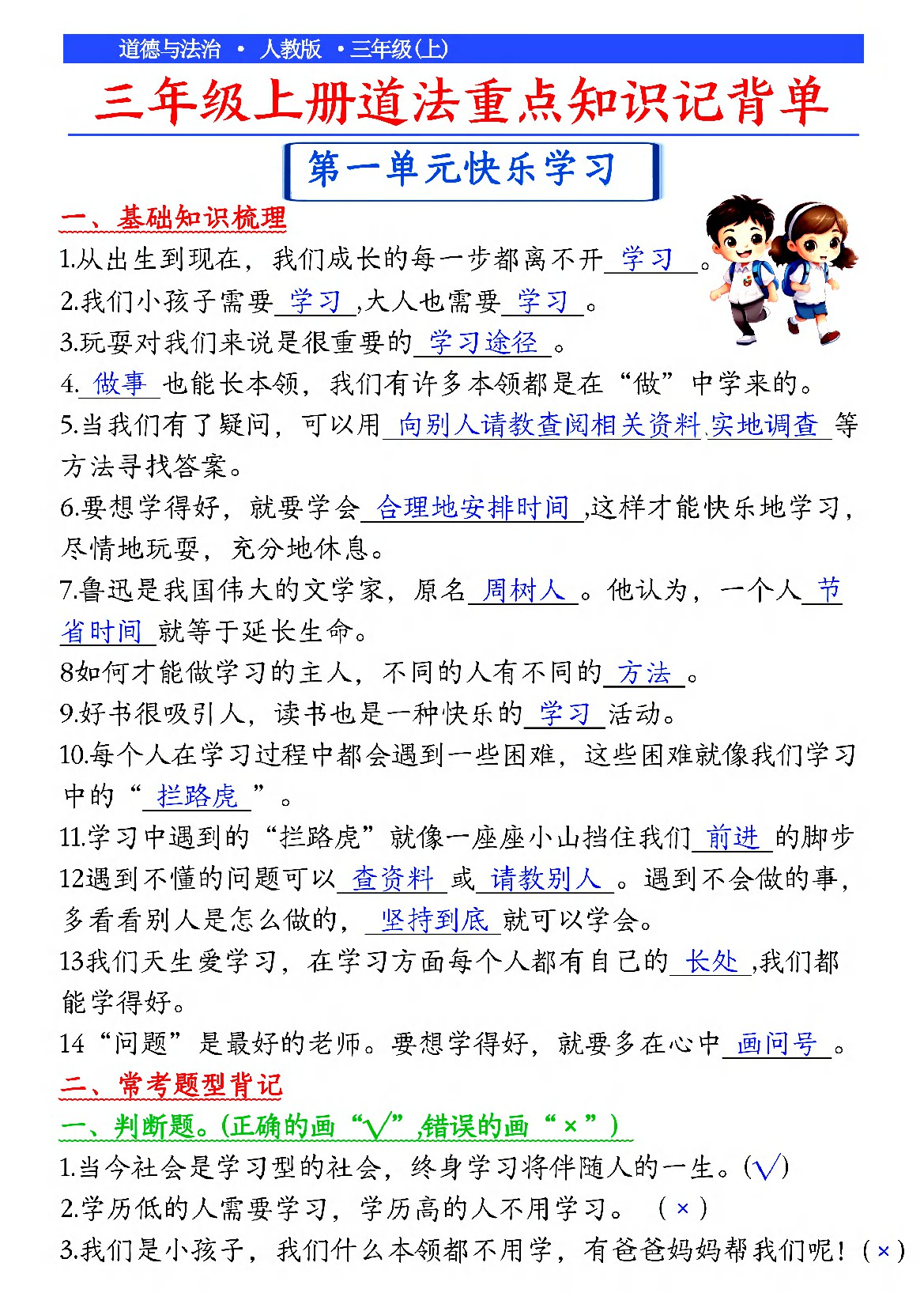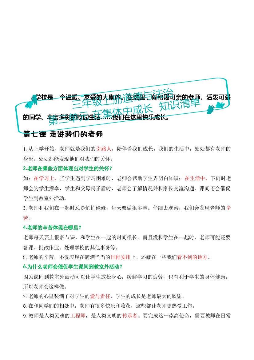【知识点】25秋三年级上册道法第三单元在集体中成长(知识清单)(新教材)