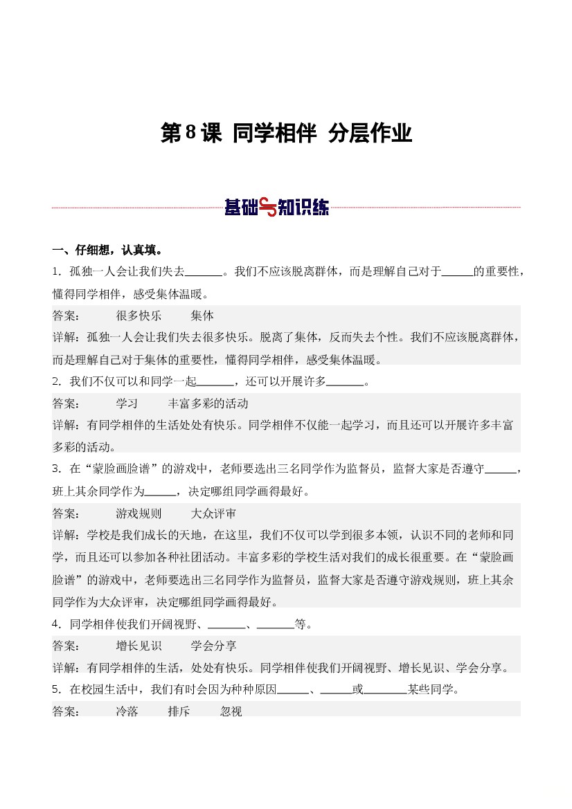 25秋三年级上册道法同步练习第8课 同学相伴(教师版)