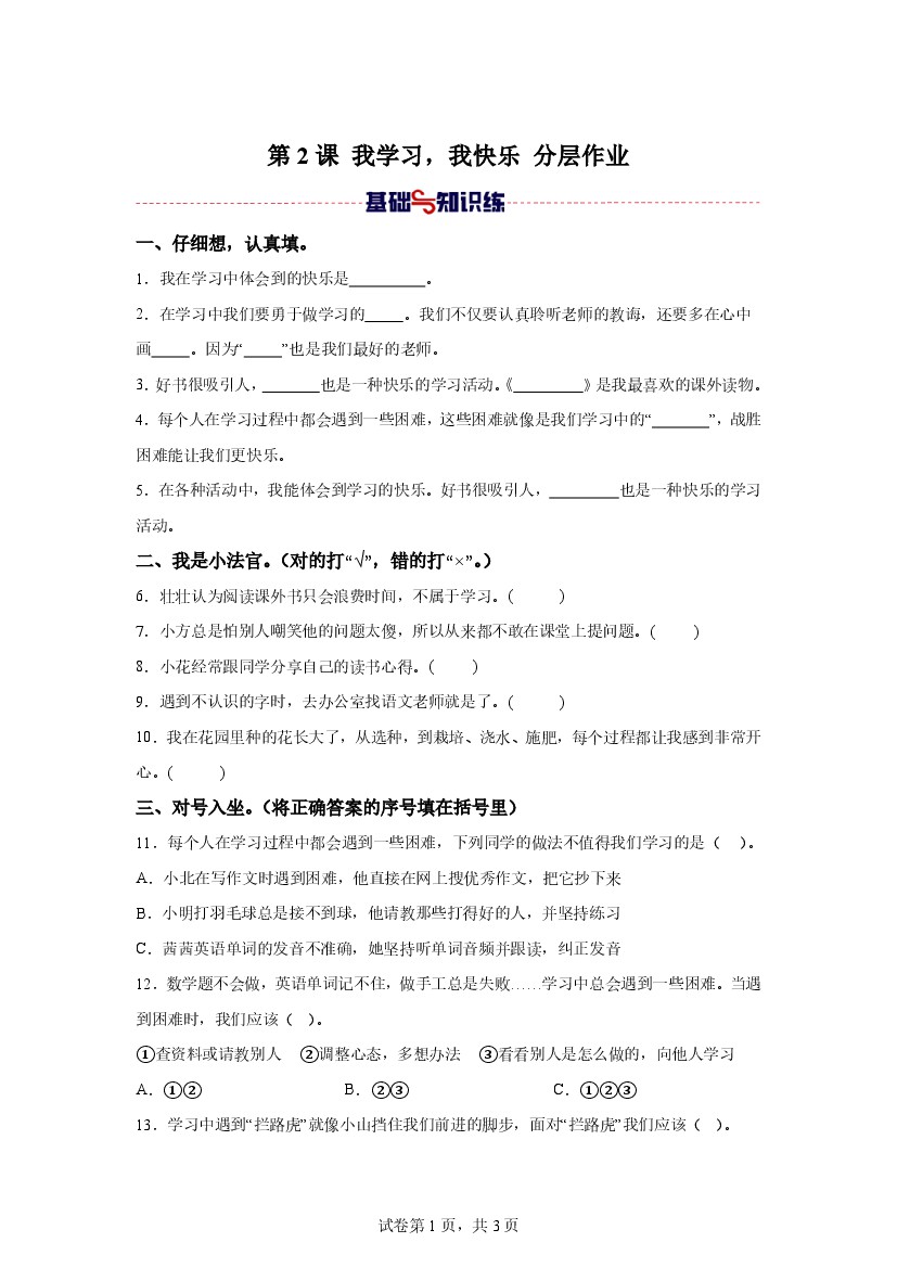 统编版道德与法治三年级上册2 我学习我快乐分层作业卷