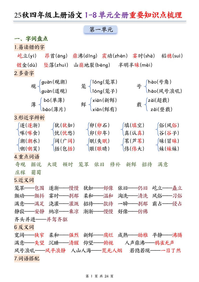 25秋四上语文1-8单元全册重要知识点梳理(24页)