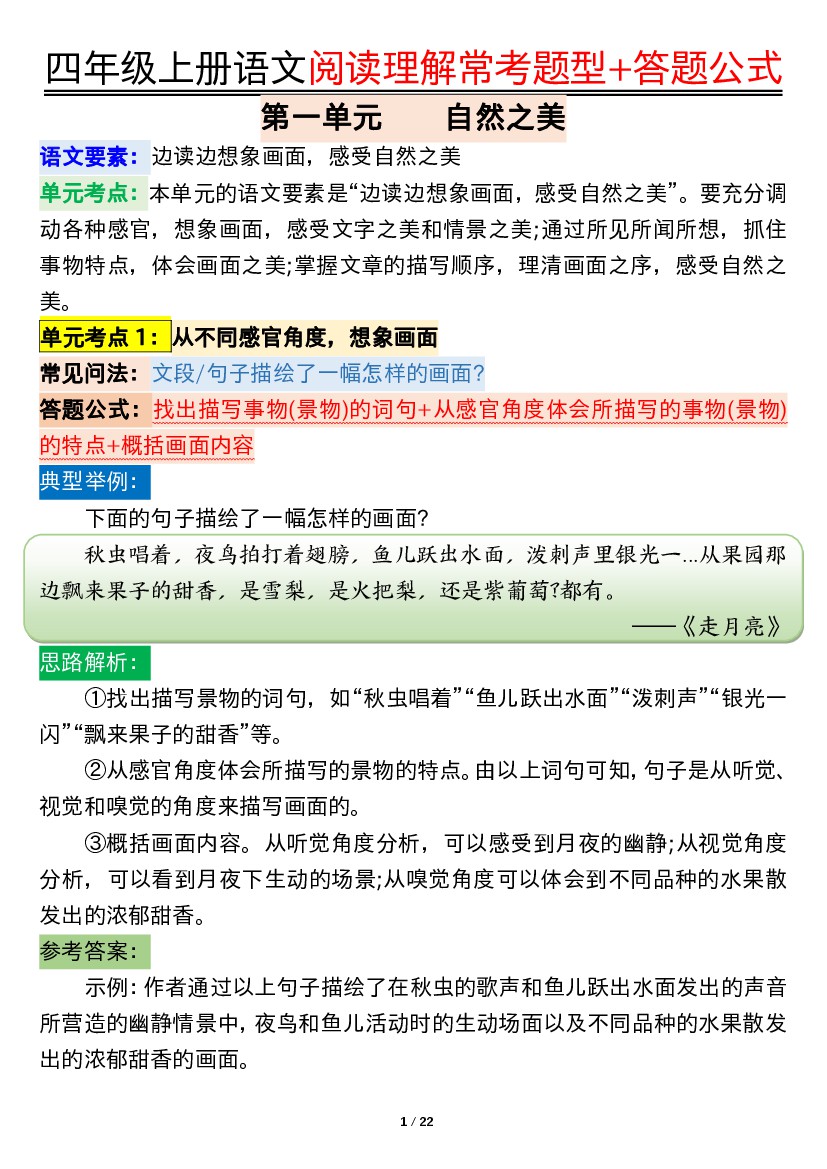 【阅读理解常考题型+答题公式】四上语文