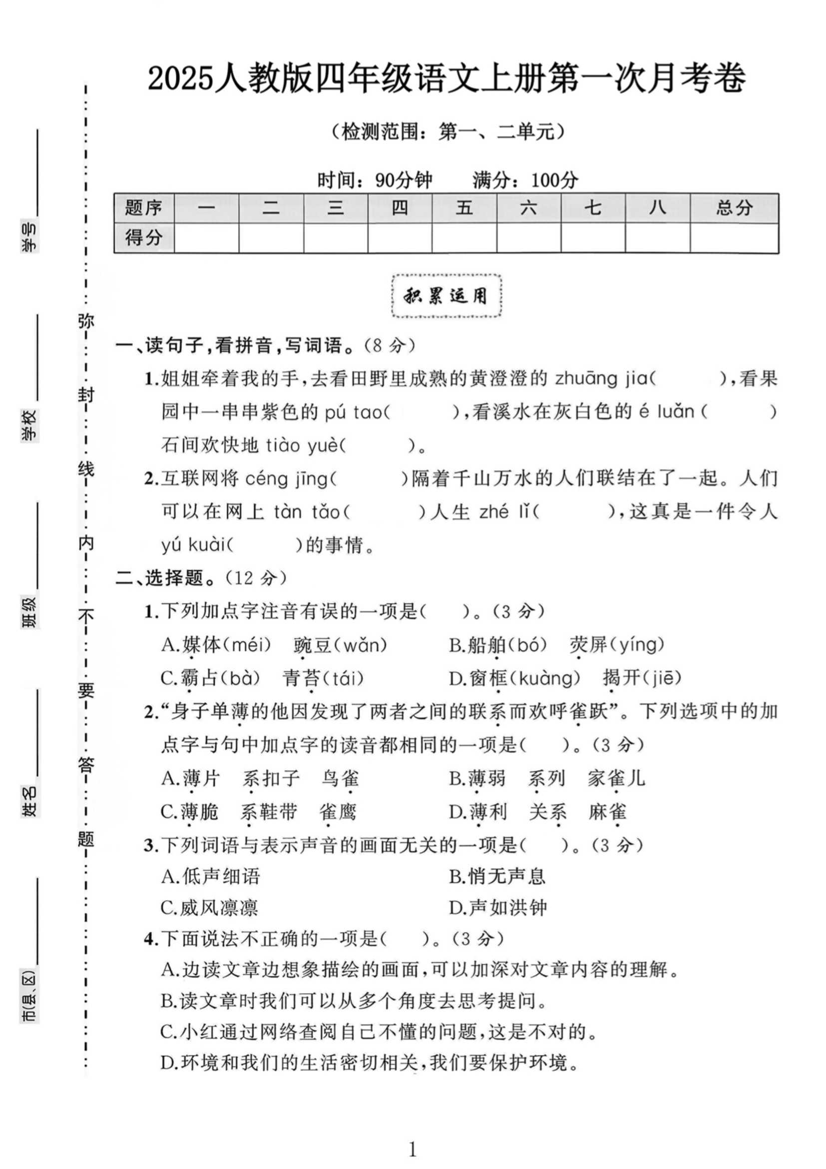四上语文第一次月考卷