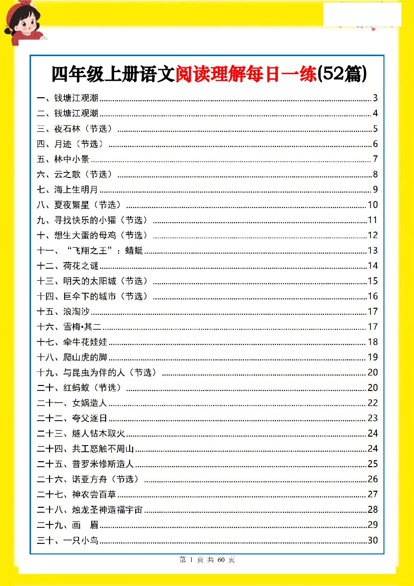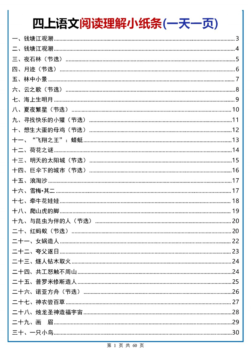 四上语文阅读理解每日一练52篇(含答案60页)