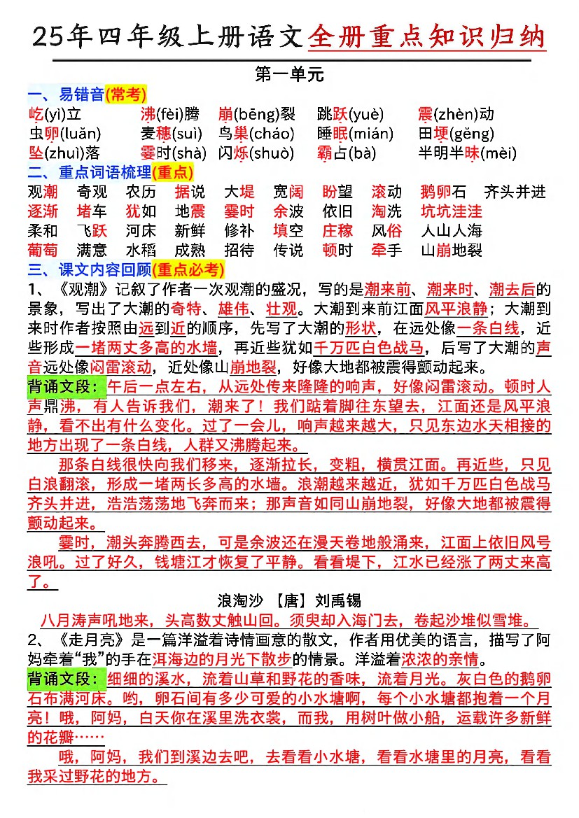 25年四上语文1-8单元全册重点知识归类汇总