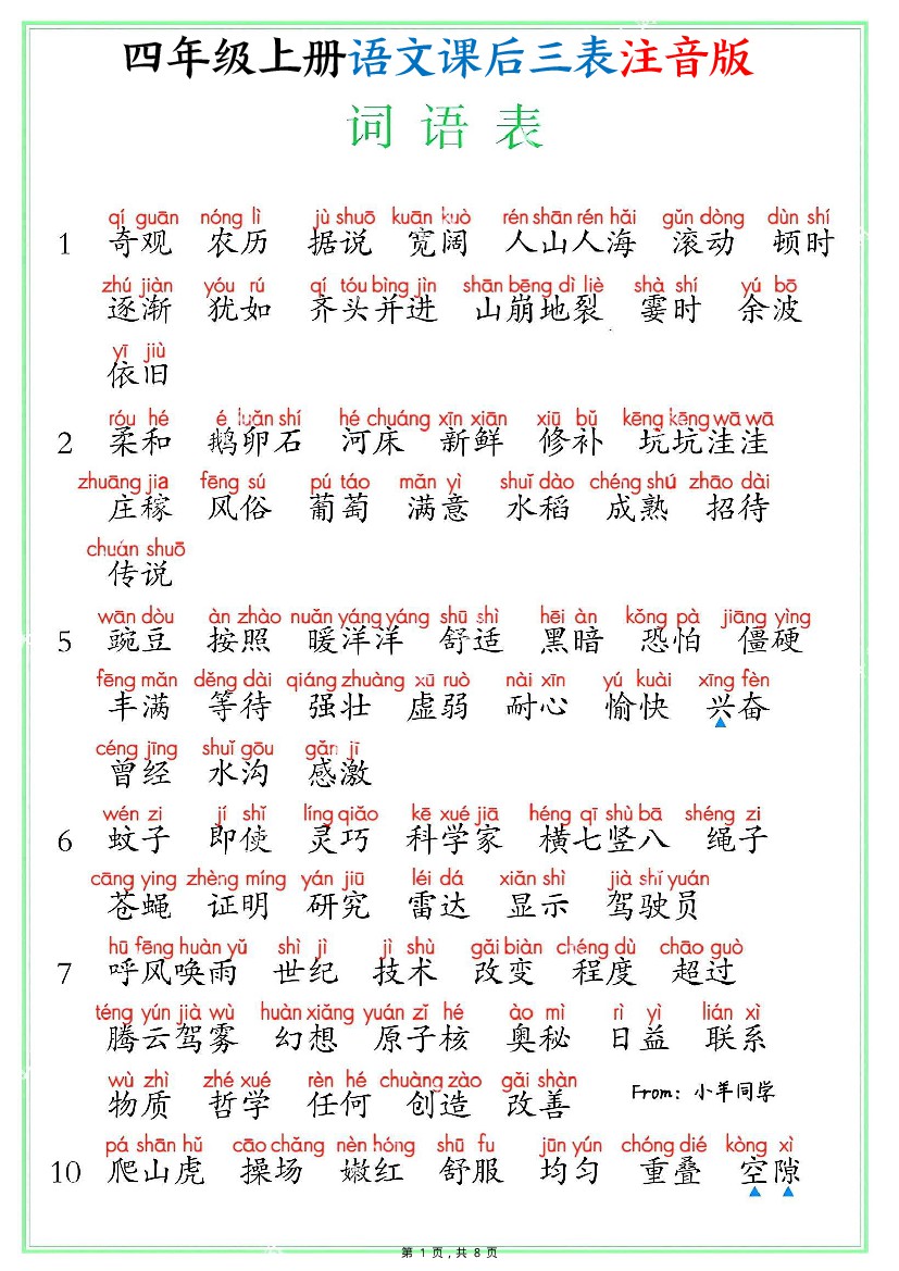 四上语文课后三表注音版(写字表识字表词语表8页)