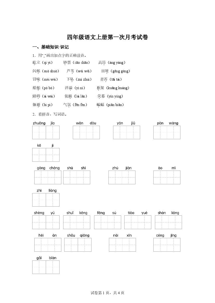四年级(上)语文 期中专项训练专题1:字音辨析
