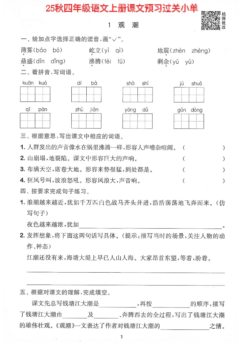 四年级语文上册课文预习过关单