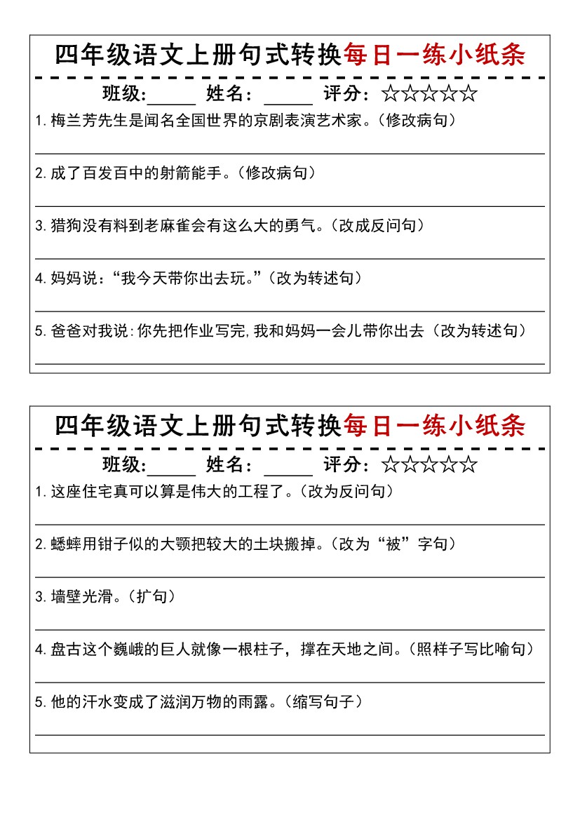 四年级上册语文句式转换每日一练小纸条