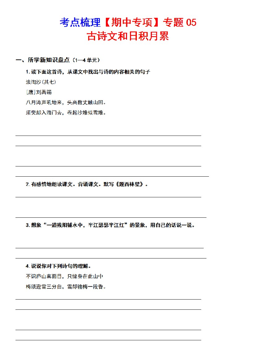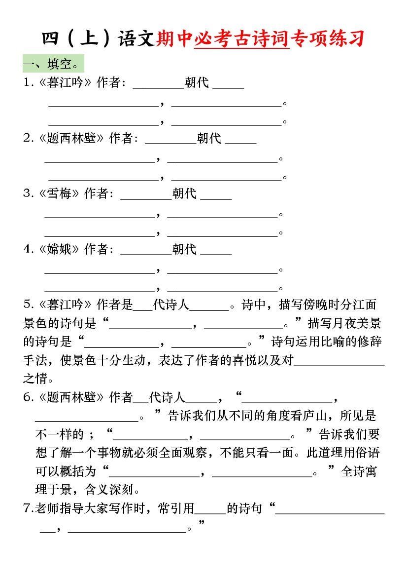 四上语文期中必考古诗词专项练习