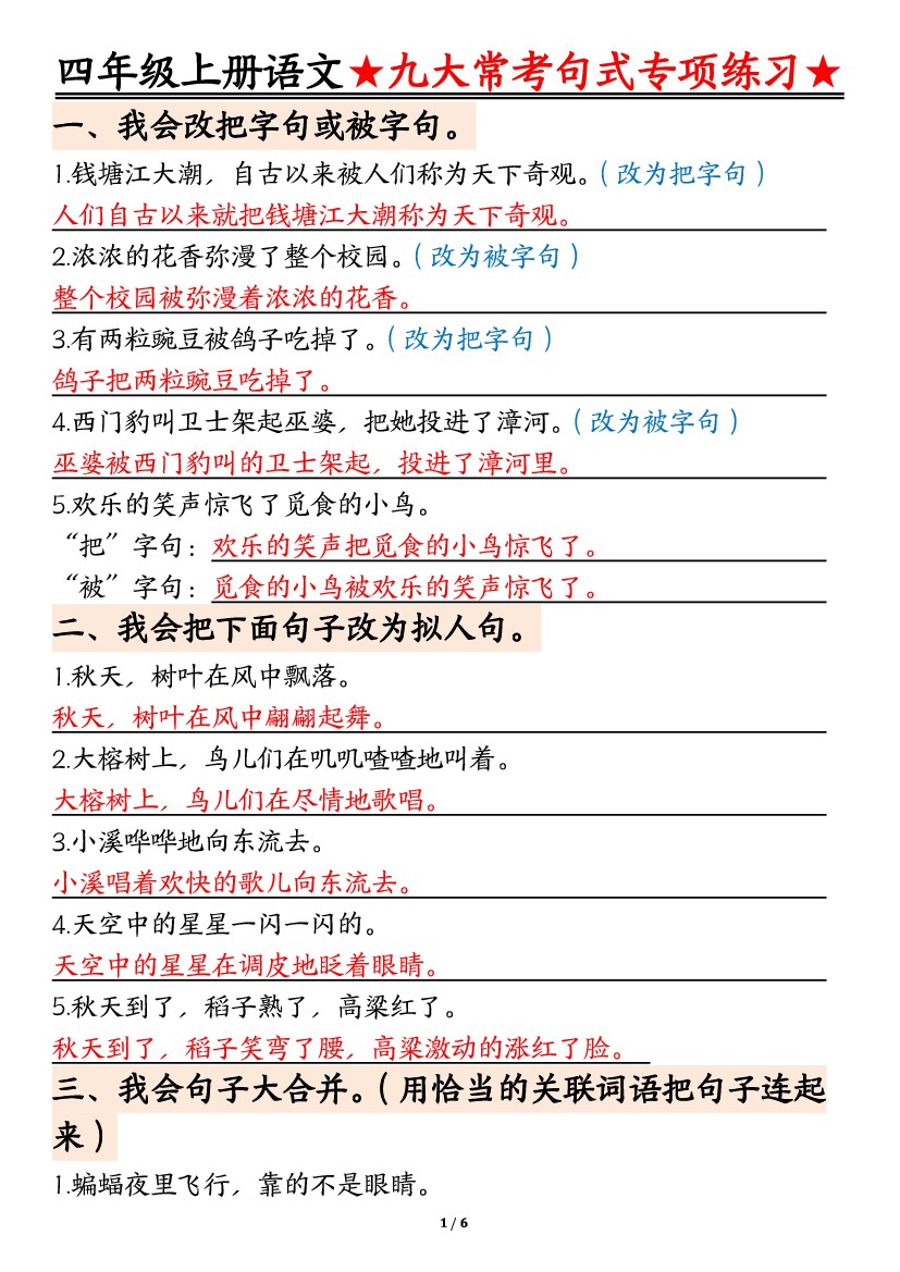 四年级上语文九大常考句式专项练习(含答案12页)
