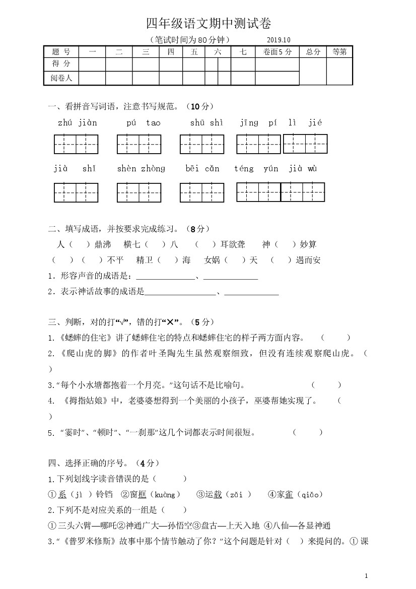 四(上)语文 期中真题检测卷_1