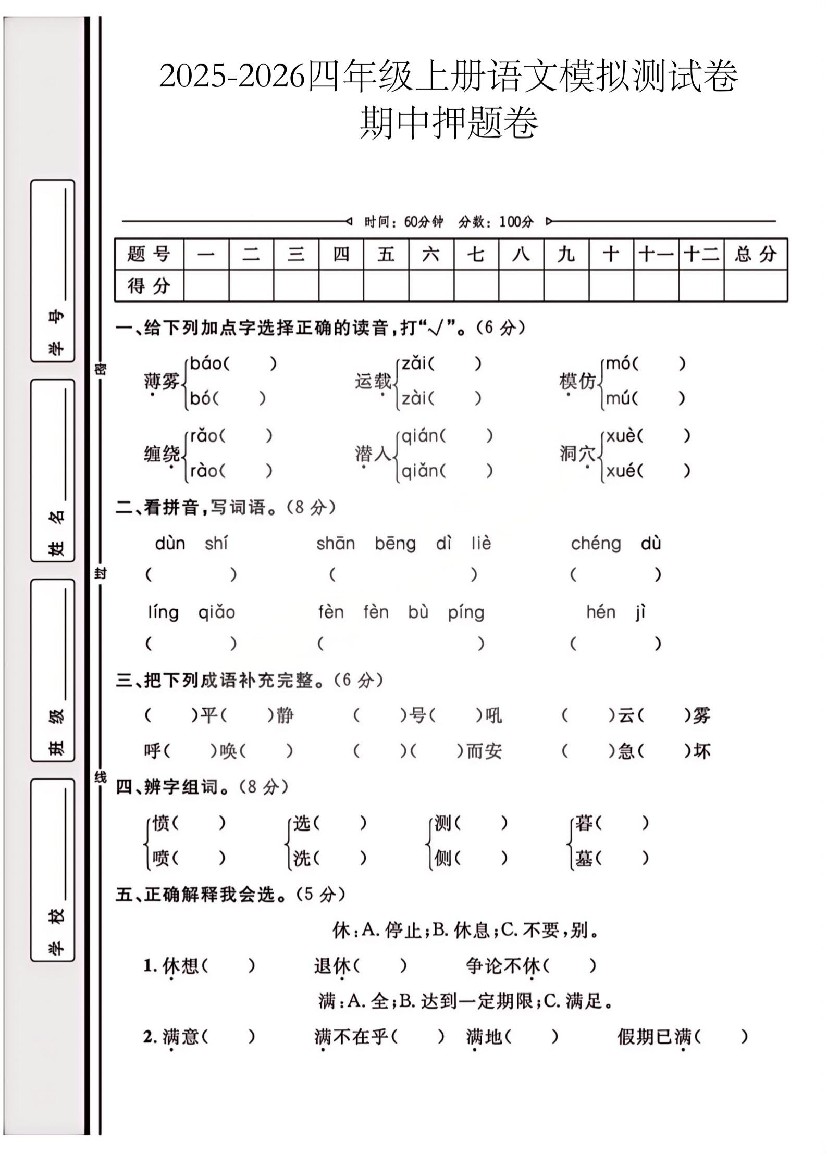 四上25秋语文期中模拟测试卷
