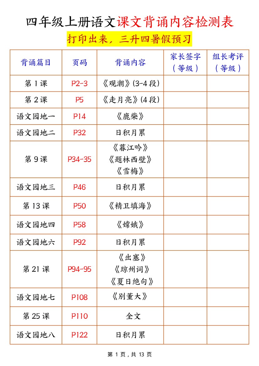 三升四暑假预习四上语文课文背诵内容检测表(13页)