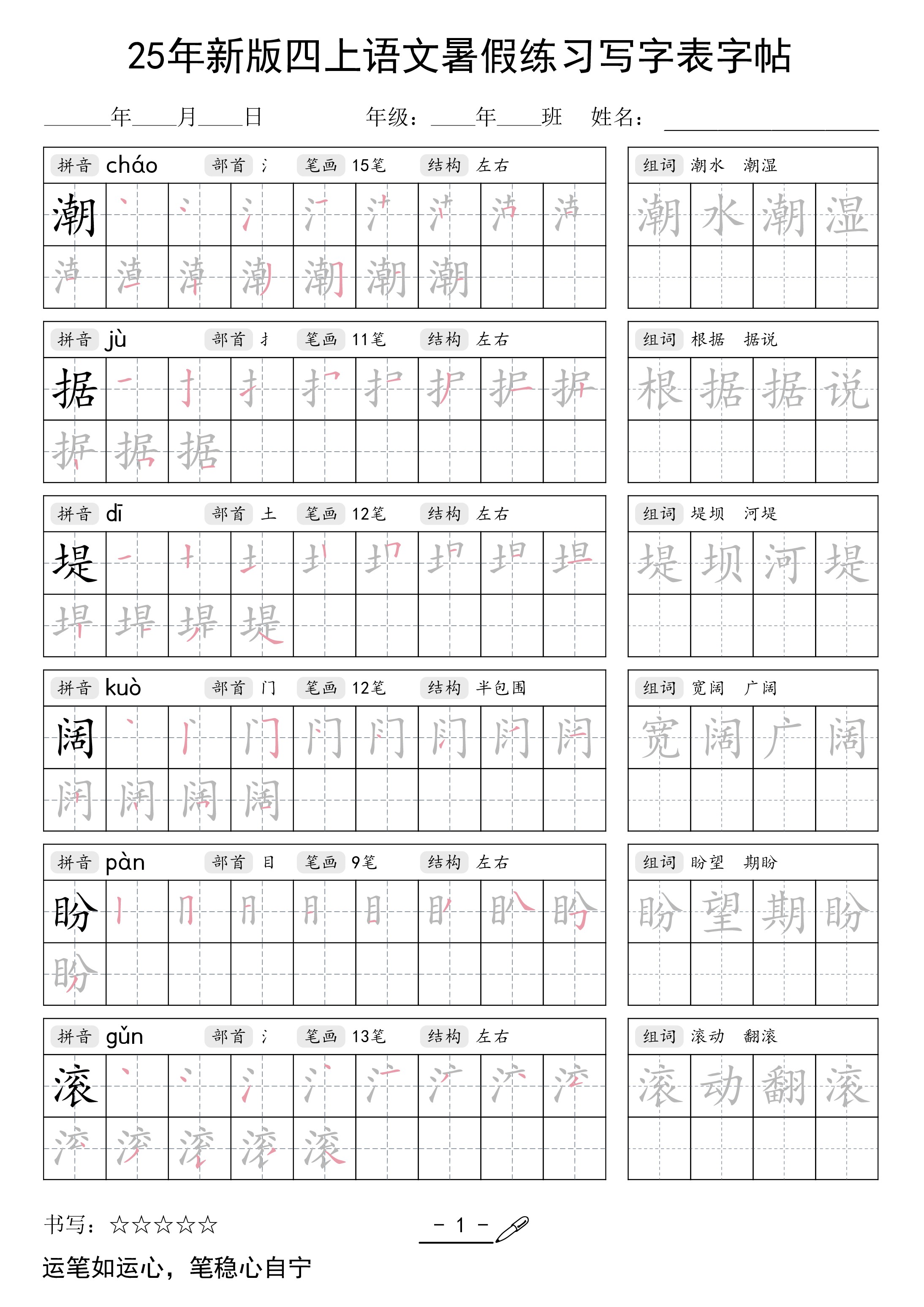 25年新版四上语文暑假练习写字表字帖42页