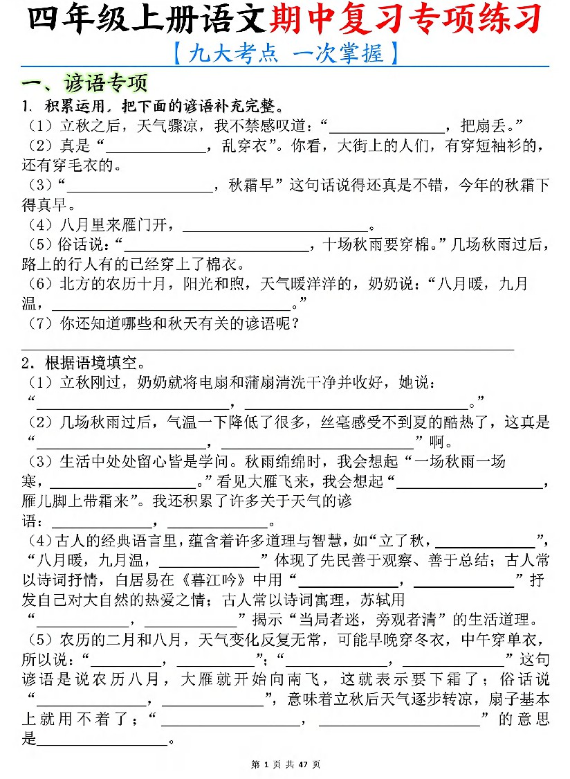 【期中复习专项练(九大考点)】四上语文