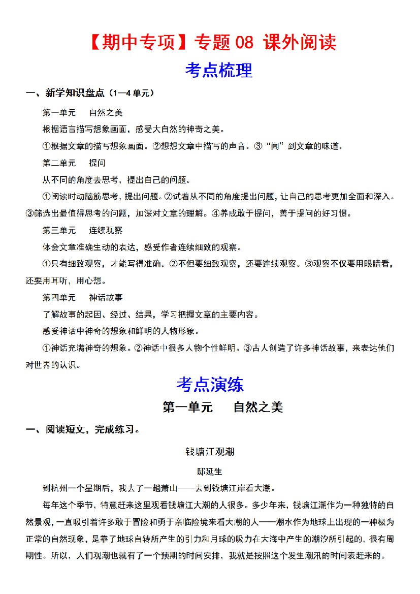 专题 08课外阅读(1—4单元每个单元三到四篇)(考点+试题)四年级语文上册期中专项复习(统编版)