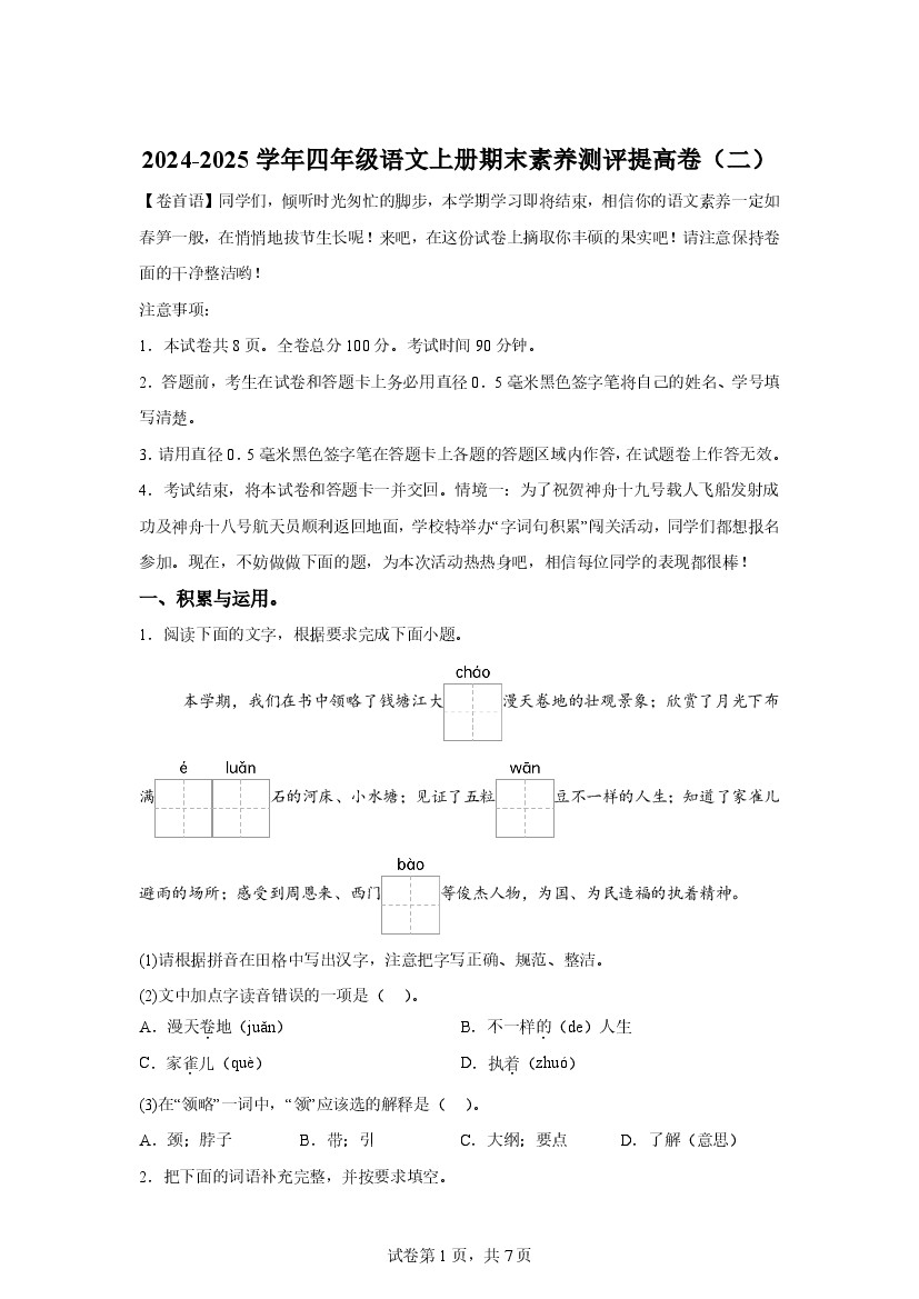 语文(提高卷02)四年级语文上学期期末全真模拟(统编版)