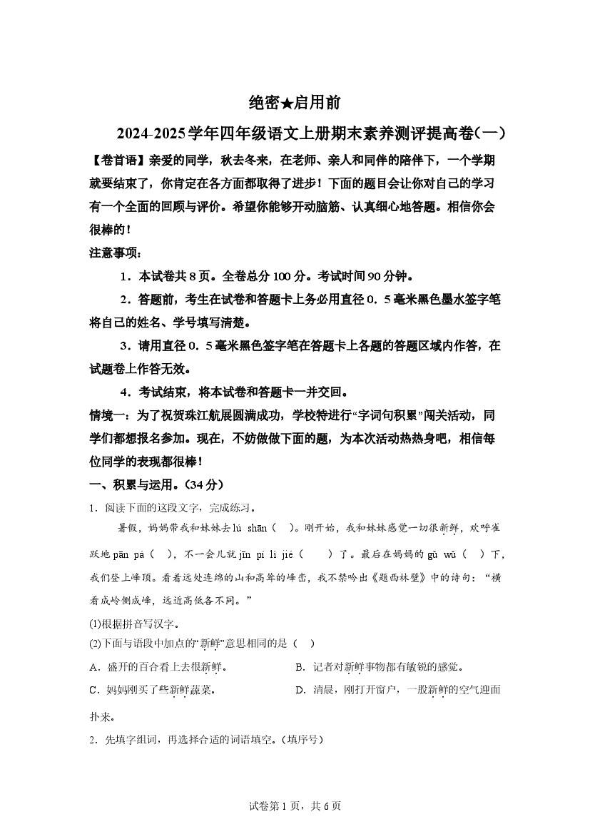 语文(提高卷01)四年级语文上学期期末全真模拟(统编版)