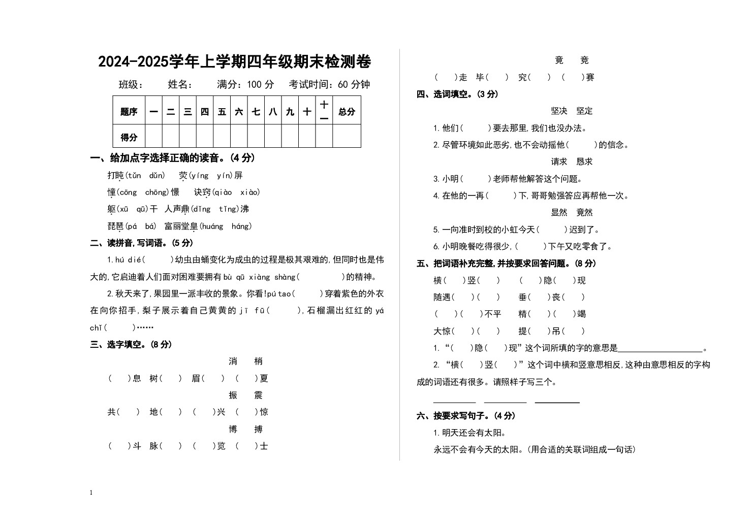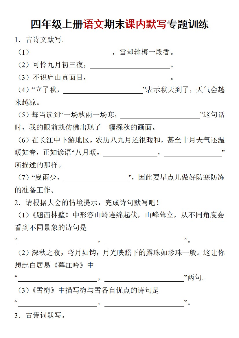 【2025秋新版】四年级上册语文期末复习必背日积月累填空练习