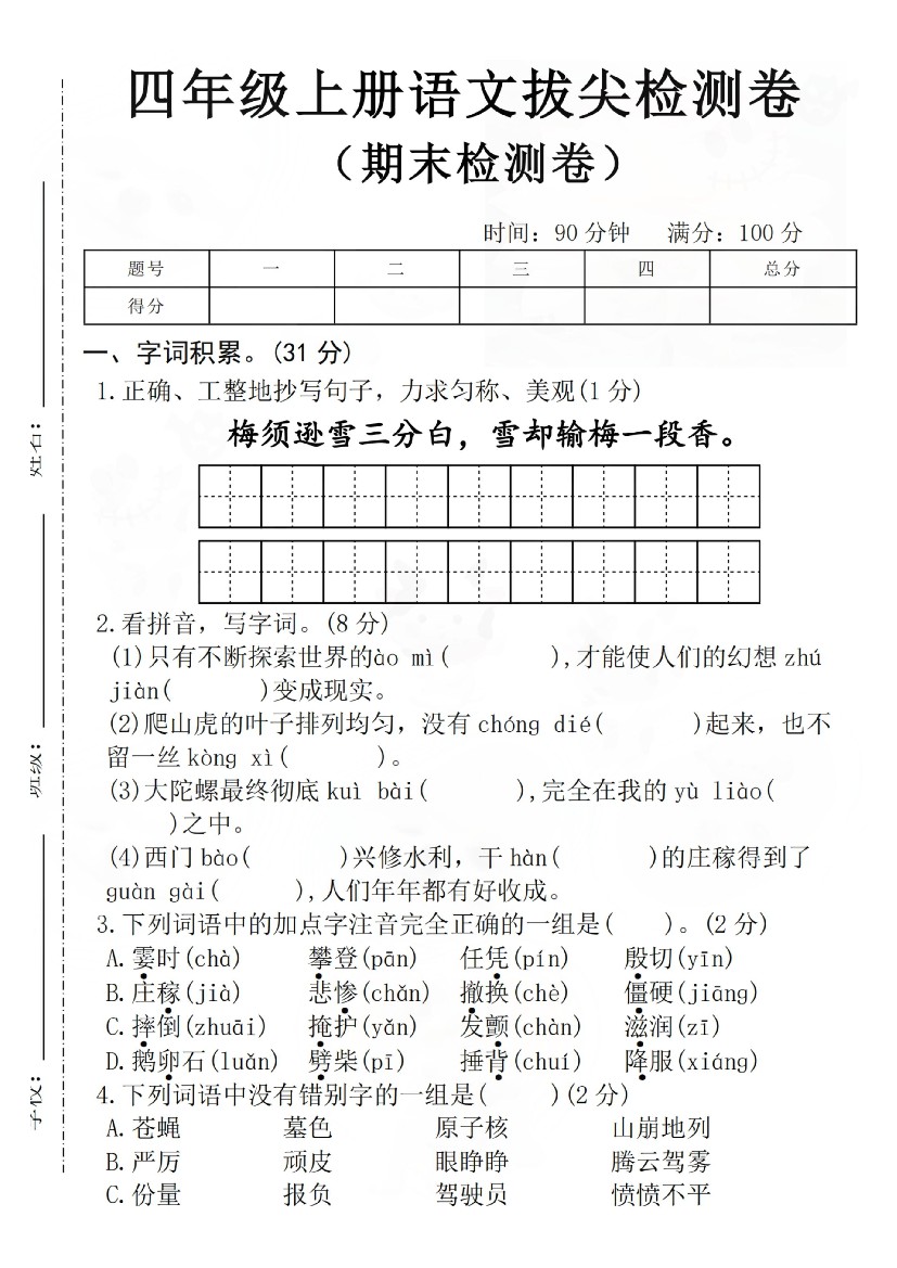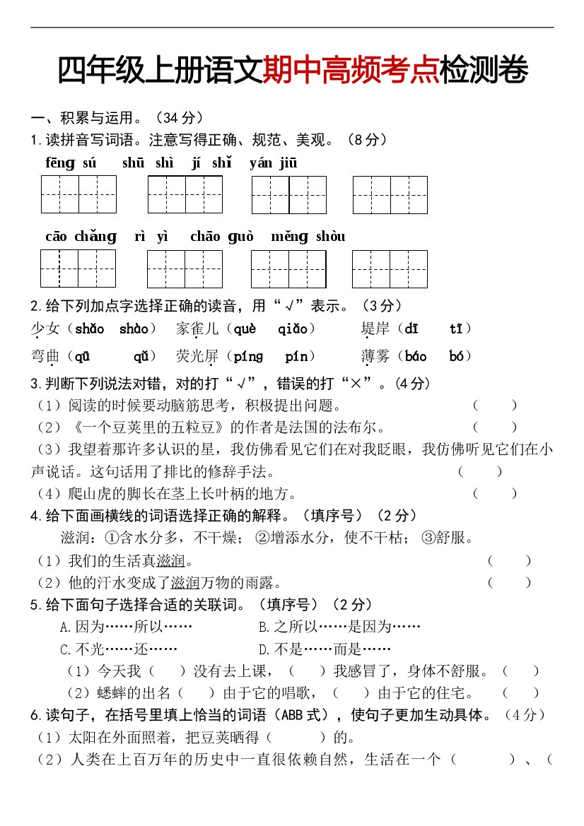 四(上)四年级上册语文期中高频考点检测卷(含答案)