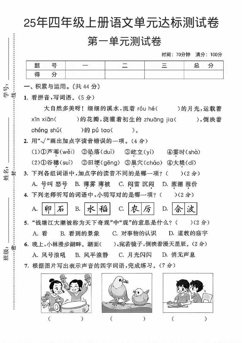 四(上)四年级上册语文期中高频考点检测卷(含答案)
