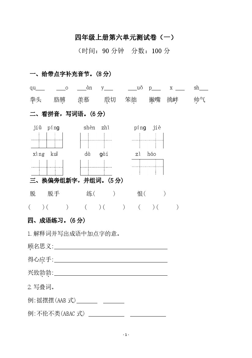 统编版语文四年级上册第六单元字词专项练