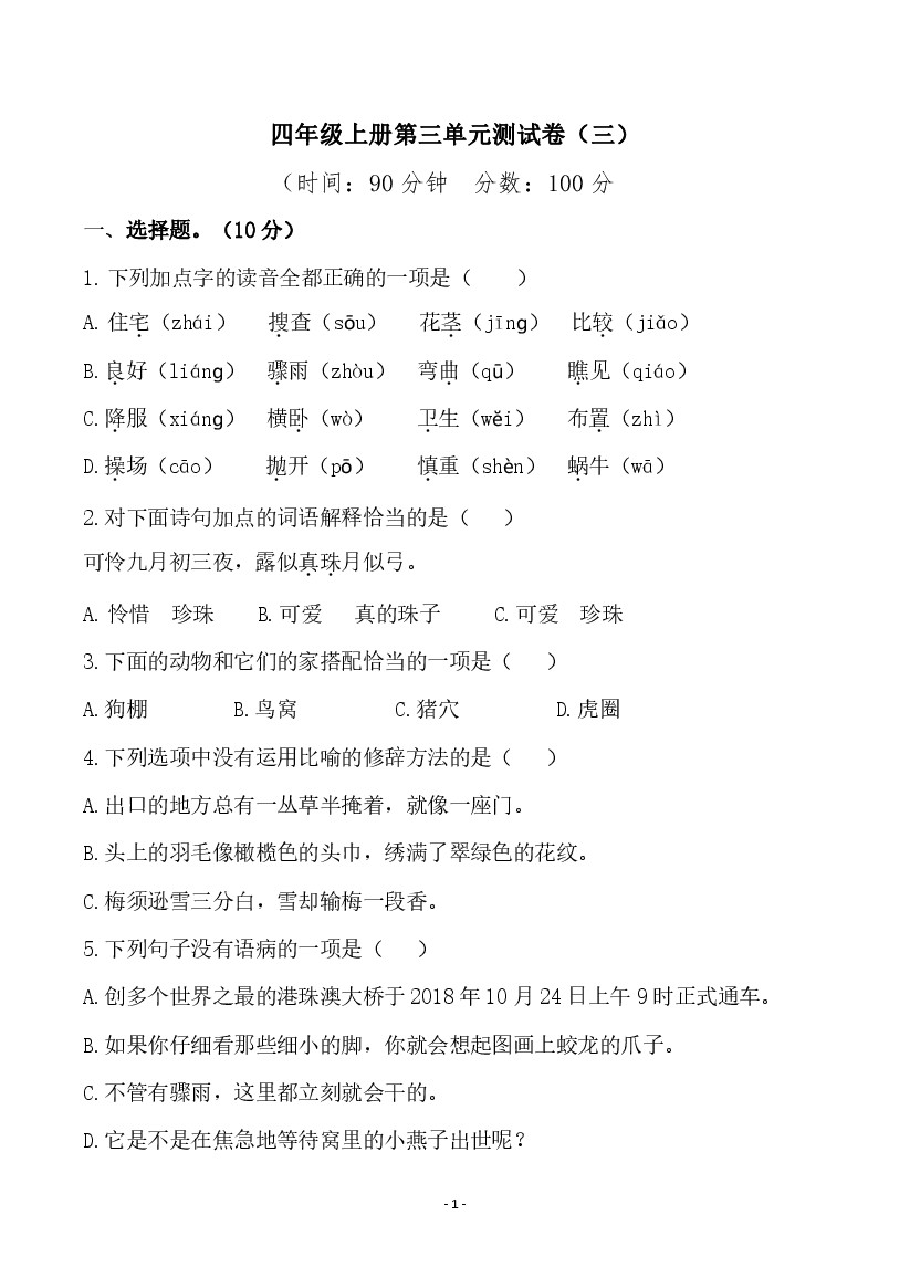 25四上语文第三单元测试