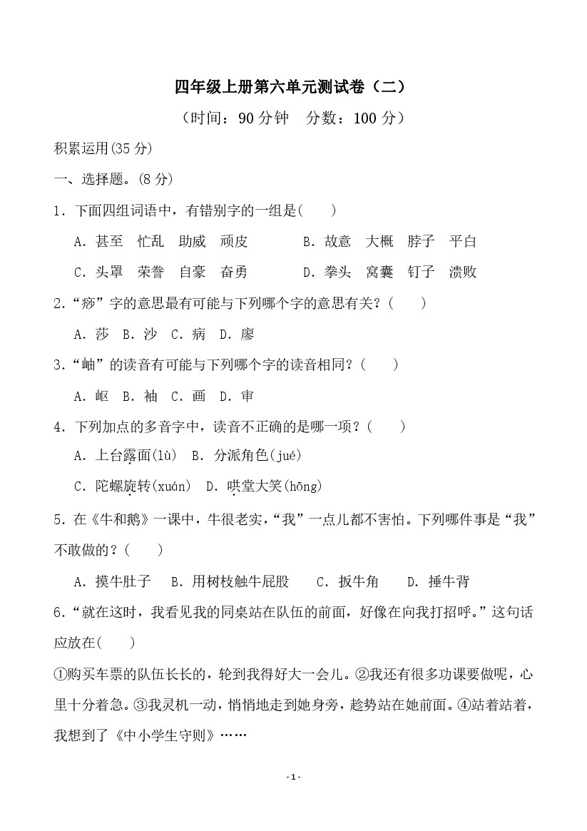 四(上)语文第六单元检测试卷(一)